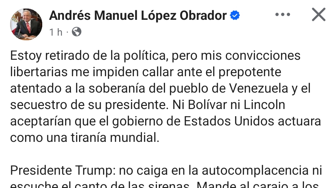El expresidente de México Andrés Manuel López Obrador reapareció públicamente con una declaración política en la que condena lo que calificó como un atentado a la soberanía del pueblo de Venezuela, así como el “secuestro de su presidente”, al tiempo que lanzó un mensaje directo al gobierno de Estados Unidos y, en particular, al presidente Donald Trump.