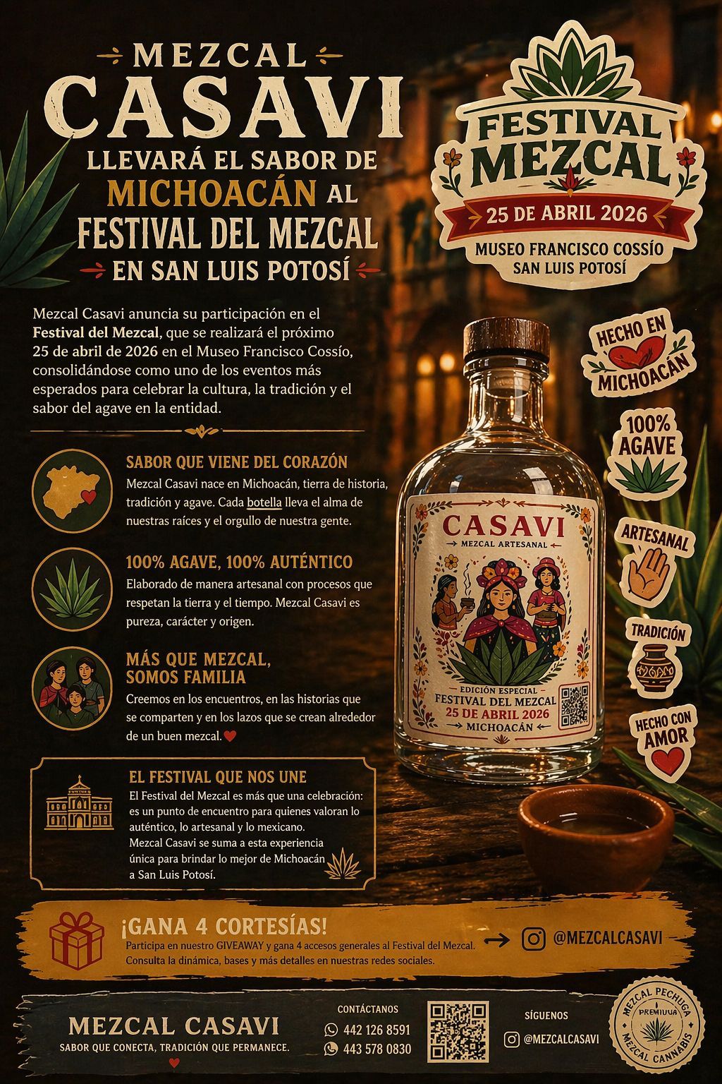 El próximo 25 de abril de 2026, el Festival del Mezcal reunirá en San Luis Potosí a diversas casas productoras del país, entre ellas Mezcal Casavi, una marca originaria de Michoacán que apuesta por procesos artesanales y una identidad ligada al origen.