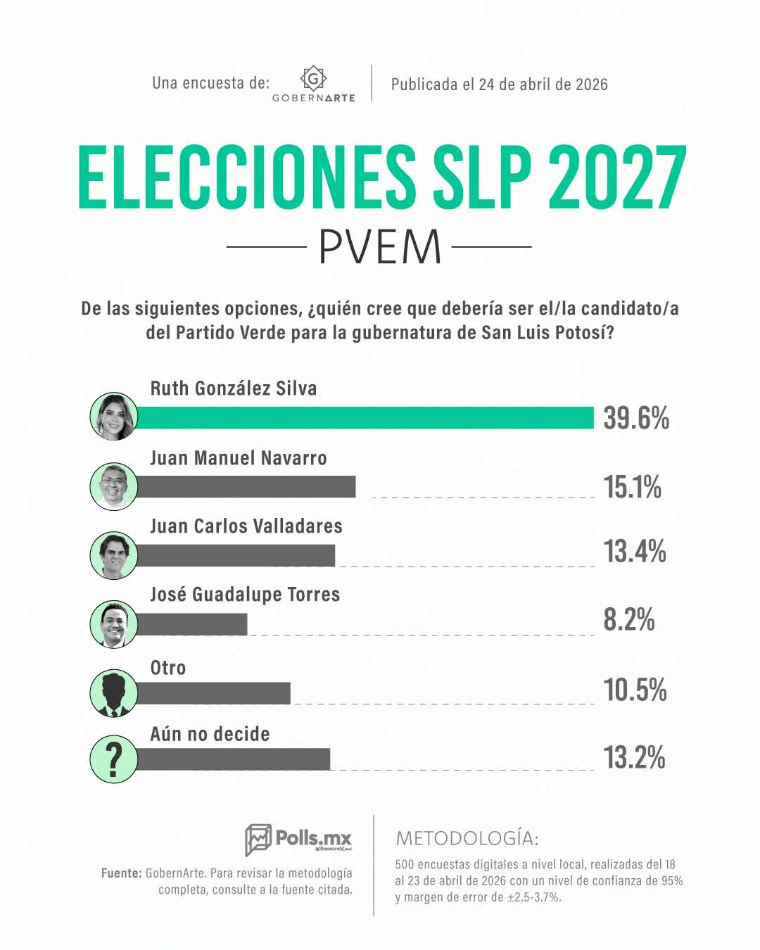 De acuerdo con datos difundidos por la encuestadora Polls MX con base en mediciones de GobernArte, González Silva concentra el 36.9% de las preferencias ciudadanas. En segundo lugar aparece el alcalde de Soledad de Graciano Sánchez, Juan Manuel Navarro, con un 15.1%, mientras que el diputado Juan Carlos Valladares se ubica en la tercera posición con 13.4%.