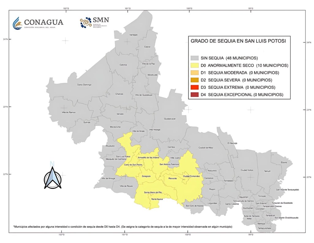 La Comisión Nacional del Agua (CONAGUA), a través del Monitor de Sequía de México del Servicio Meteorológico Nacional, informa que actualmente 48 municipios de San Luis Potosí no presentan condiciones de sequía, mientras que 10 municipios se encuentran en la categoría de “anormalmente secos” (D0).